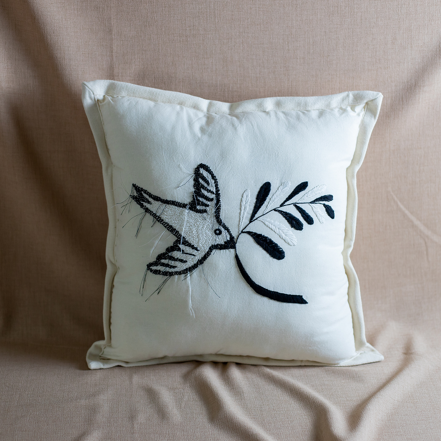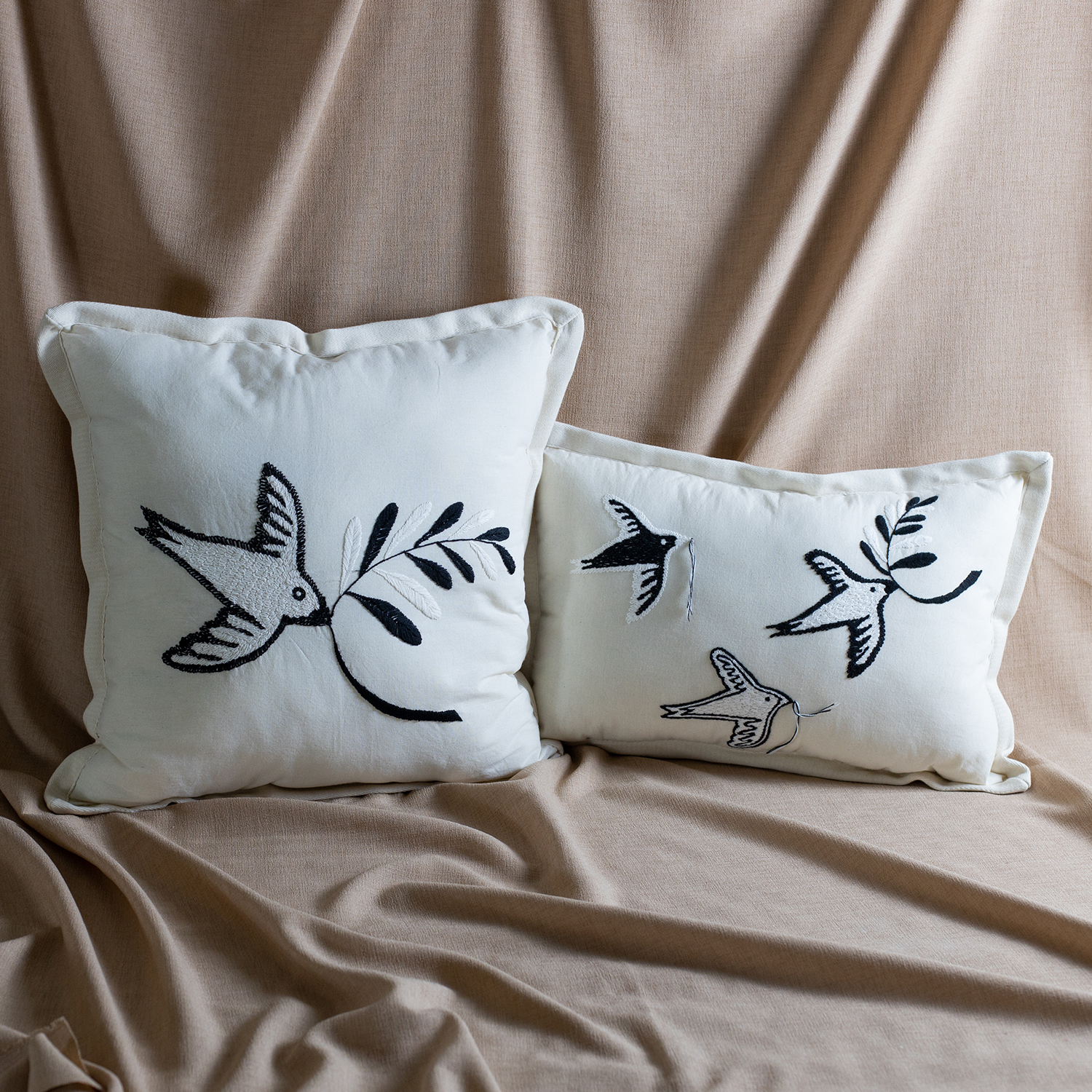 Inspirado nas andorinhas que sobrevoam a praça de Barra Longa, Ronaldo Fraga criou os desenhos que, bordados à mão pelas artesãs do grupo Meninas da Barra, estampam as almofadas que compõem a coleção Minha Casa em Mim.