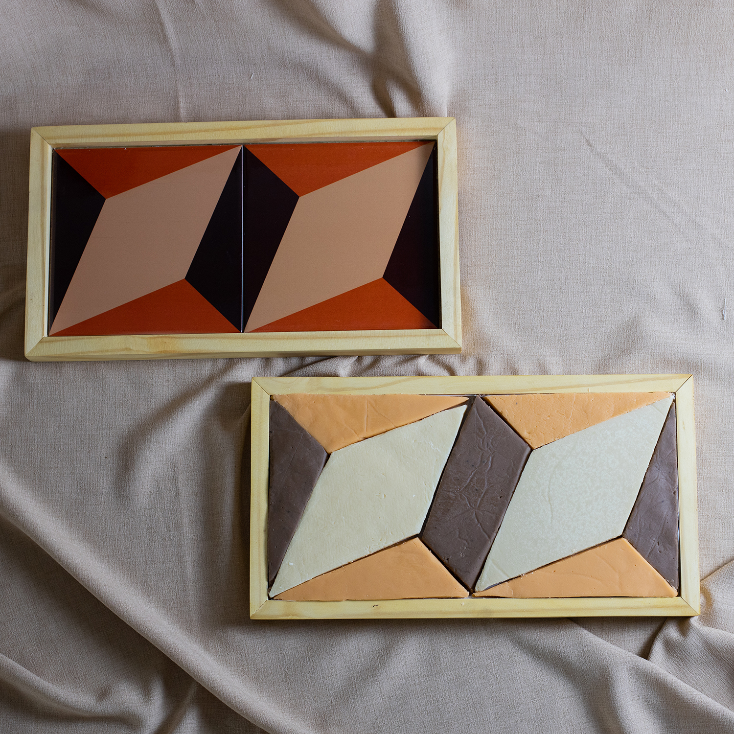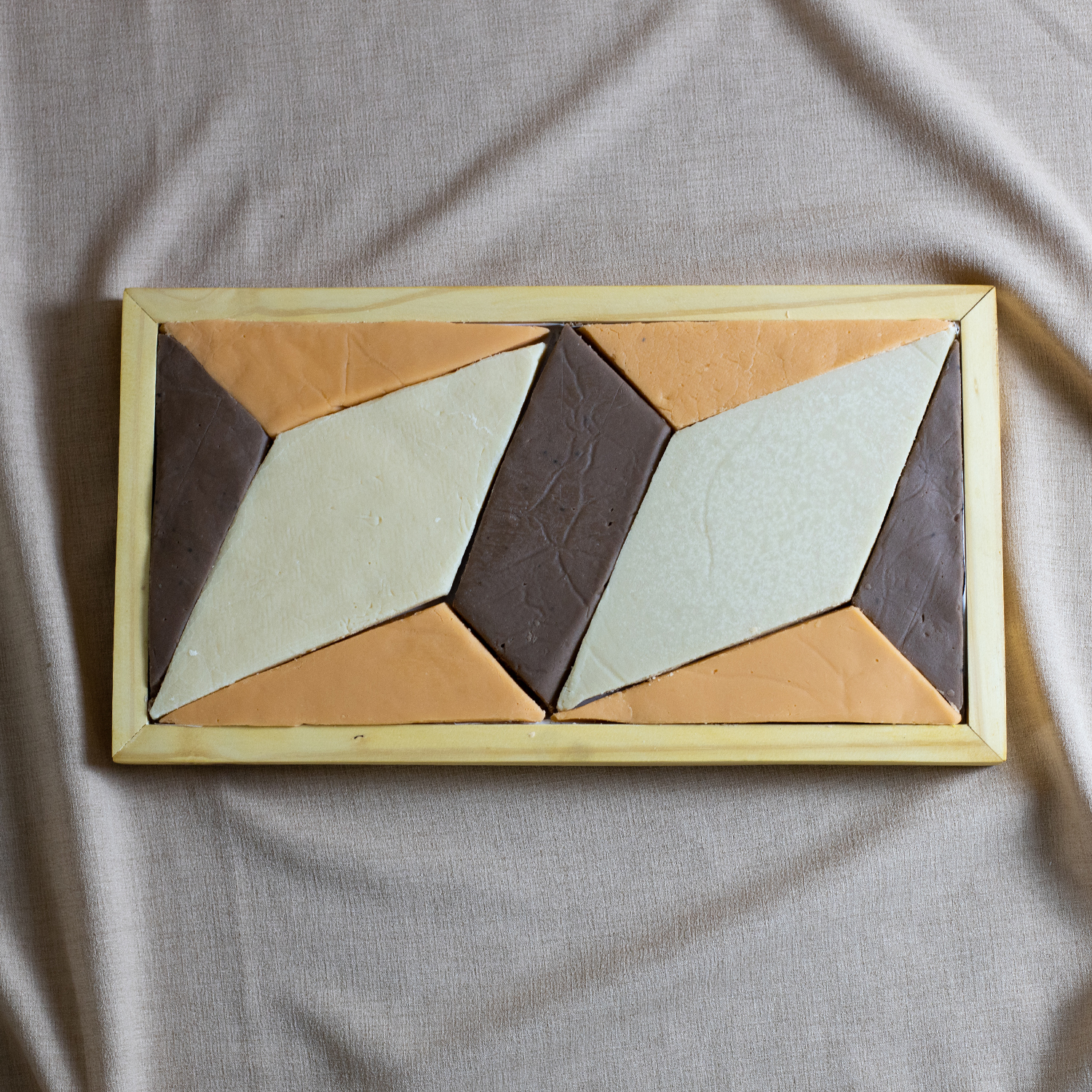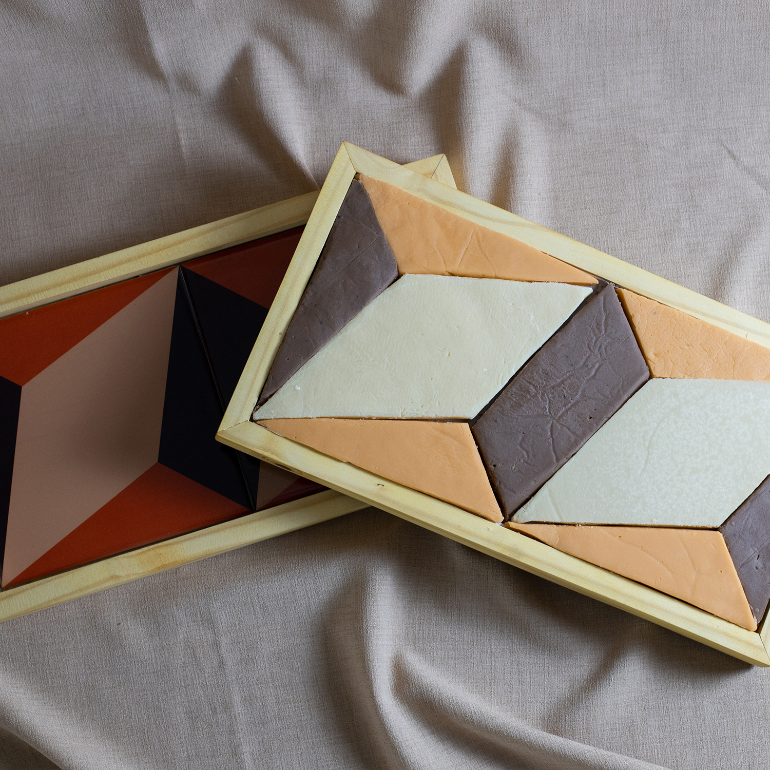 Inspirada nos ladrilhos da Igreja de São Pedro, em Mariana, a bandeja foi criada pelos artistas Arlindo Diorio e Dominique Daman. Vem acompanhada de deliciosos doces produzidos pela produtora Roseli Carneiro, do grupo FAM. É um produto colaborativo, que une gastronomia e artesanato.