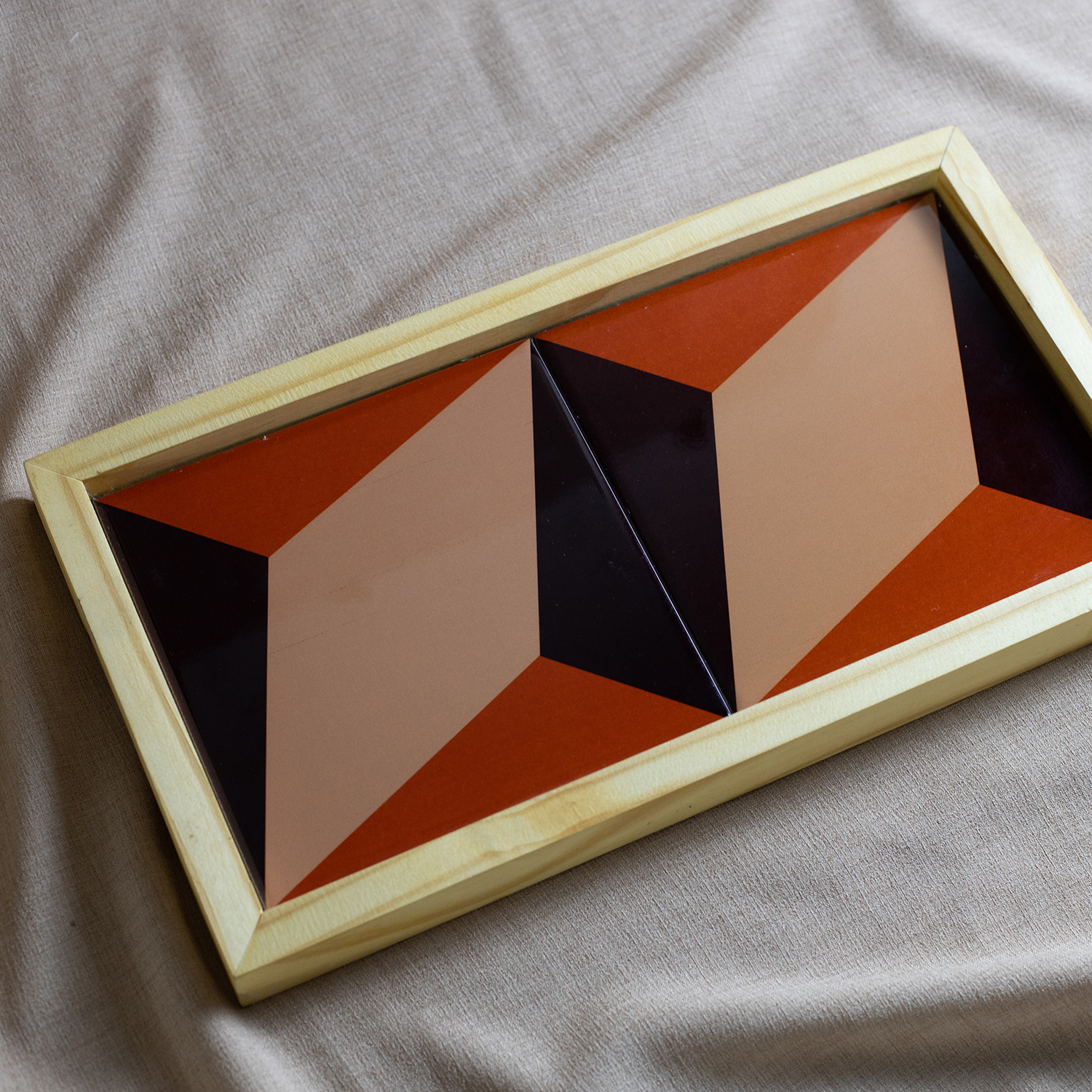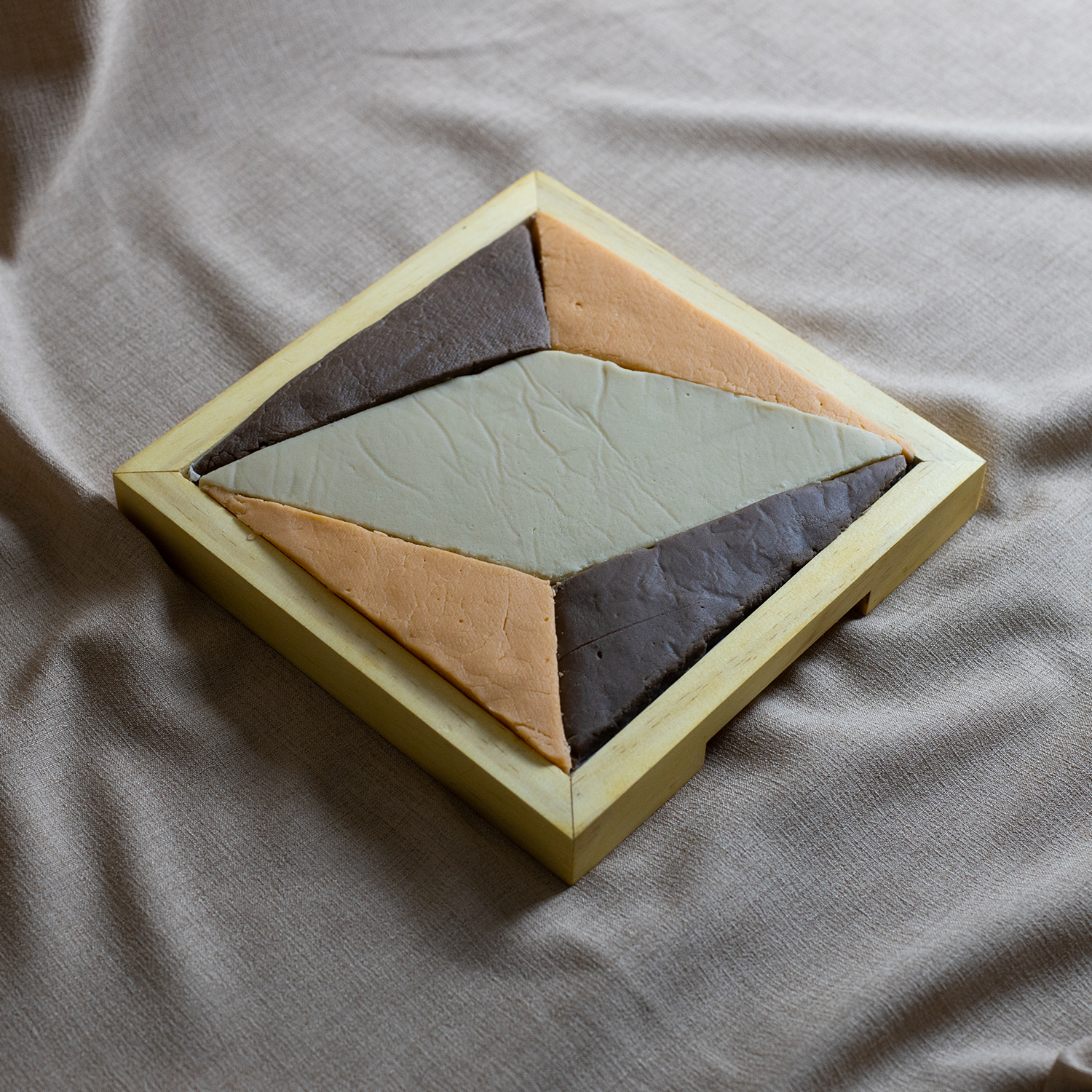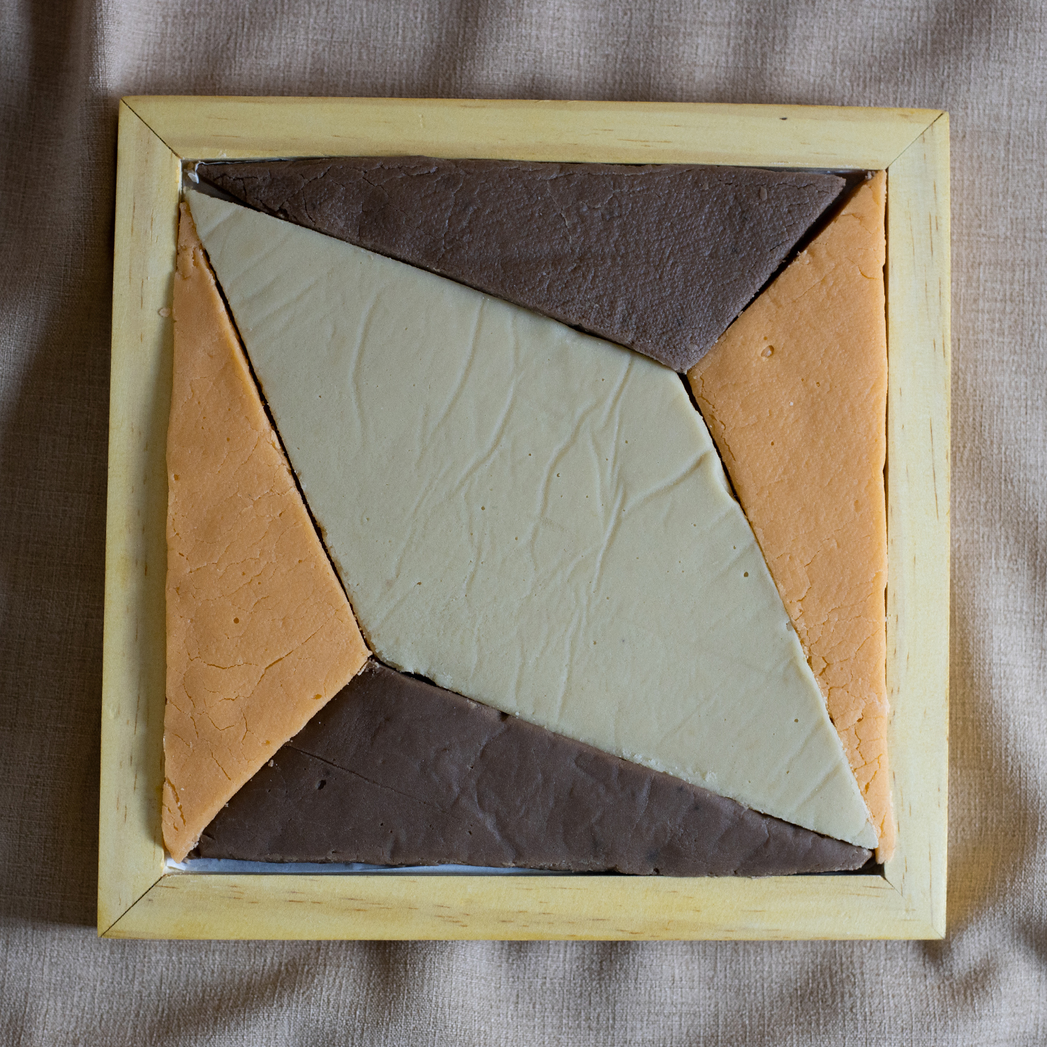 Inspirada nos ladrilhos da Igreja de São Pedro, em Mariana, a bandeja foi criada pelos artistas Arlindo Diorio e Dominique Daman. Vem acompanhada de deliciosos doces produzidos pela produtora Roseli Carneiro, do grupo FAM. É um produto colaborativo, que une gastronomia e artesanato.