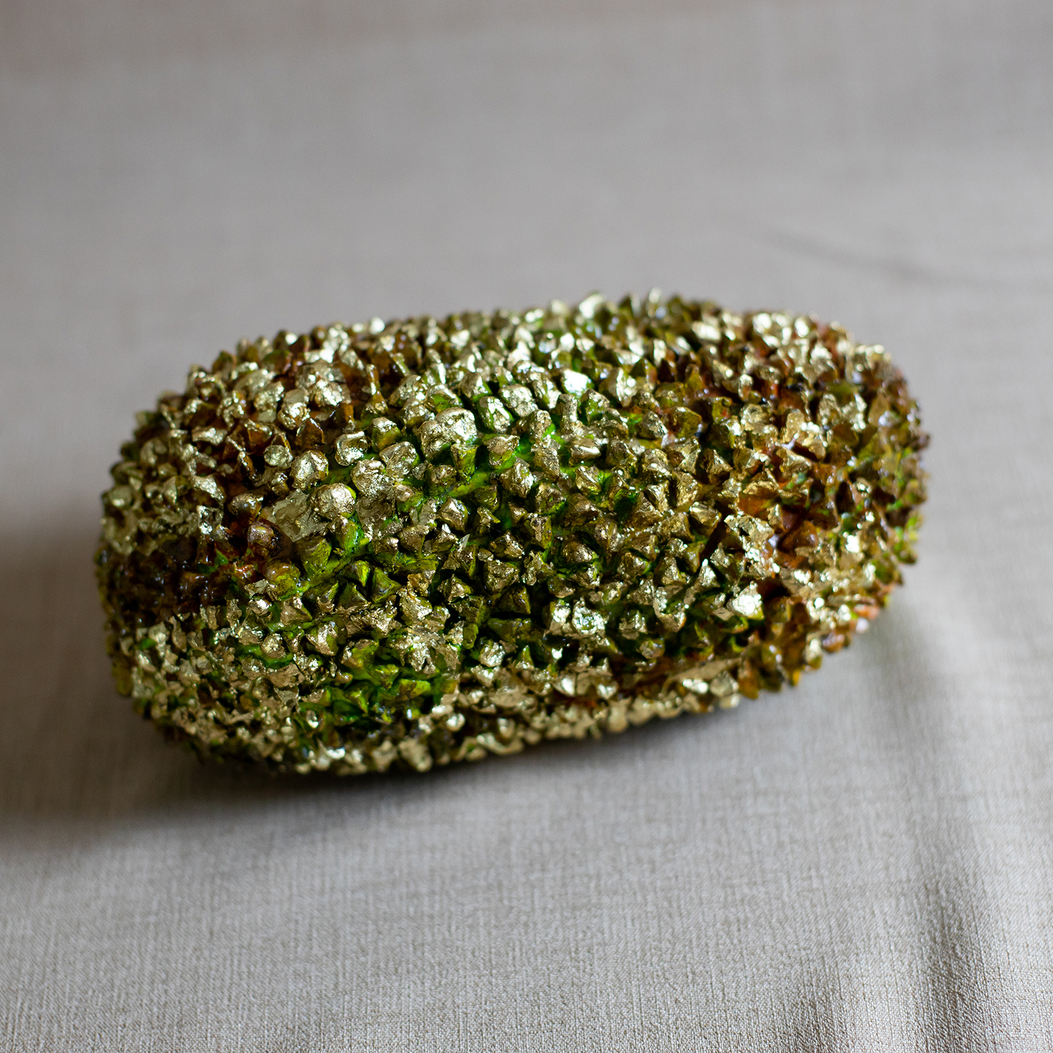 Exótica e exuberante, a jaca de ouro foi criada pelo curador Ronaldo Fraga em parceria com o mestre Babá Santana. O item é produzido pelas artesãs de Cláudio Manoel com papel, cola e folha de ouro, utilizando a técnica de papietagem. A limpeza da peça deve ser feita com um pano seco.