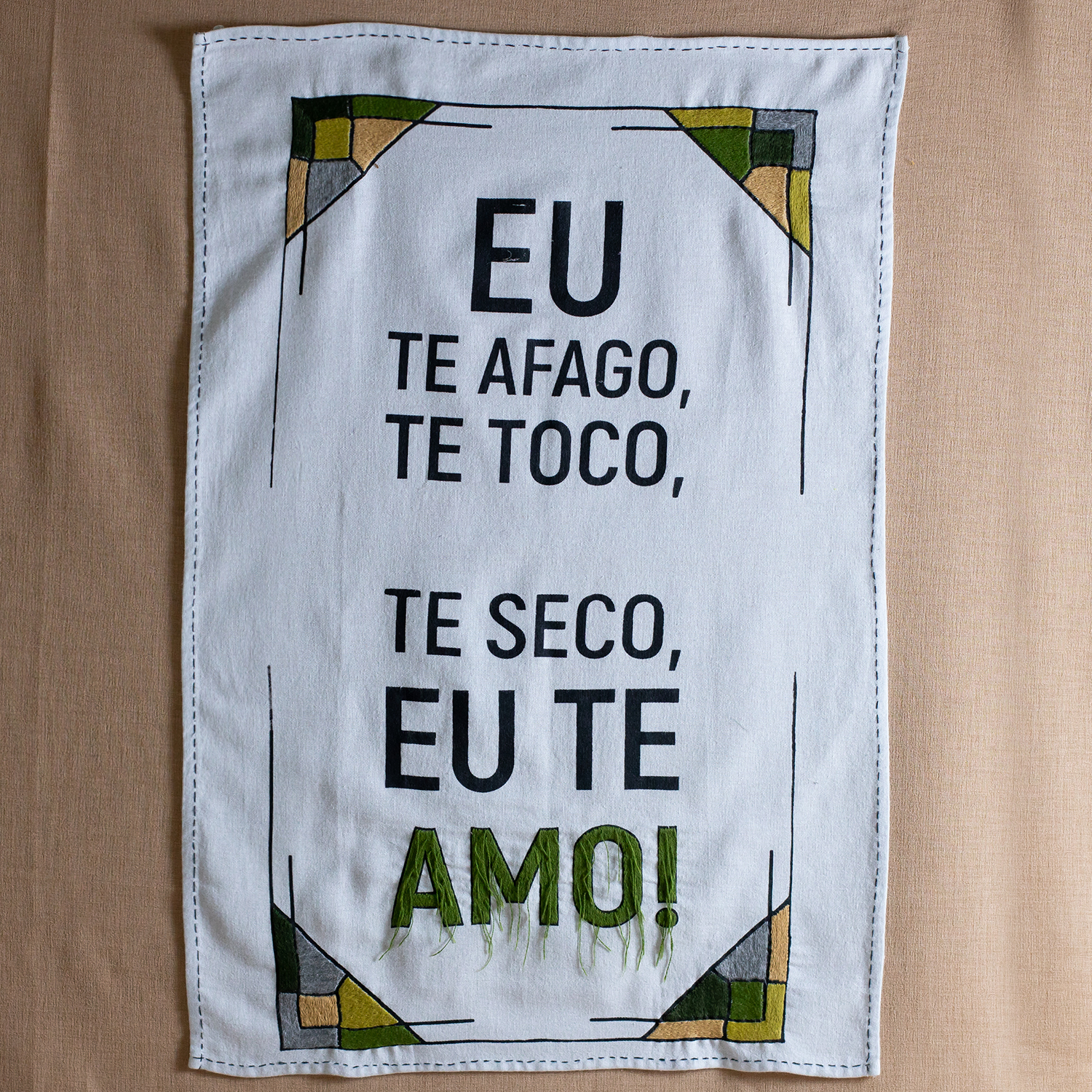 Com desenhos exclusivos desenvolvidos pelo estilista Ronaldo Fraga, os panos de prato da coleção trazem o charme do bordado livre aplicado sobre o silk confeccionado artesanalmente. Com frases divertidas, o produto traz humor para a cozinha e mais leveza para o cotidiano.