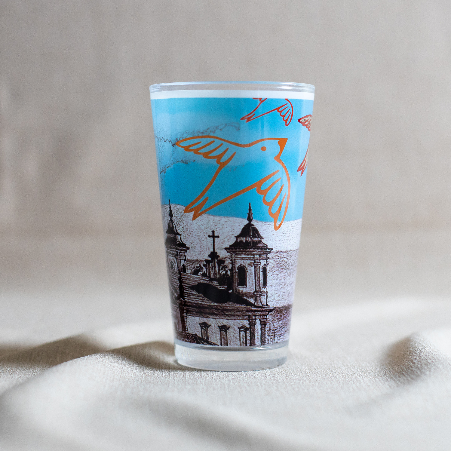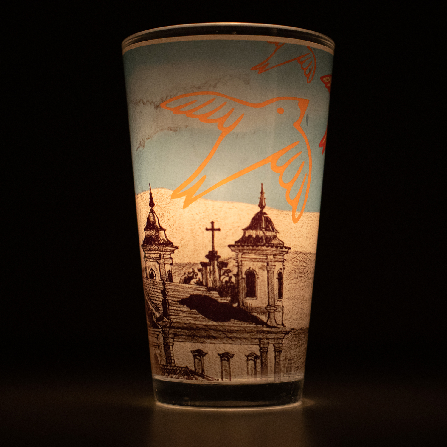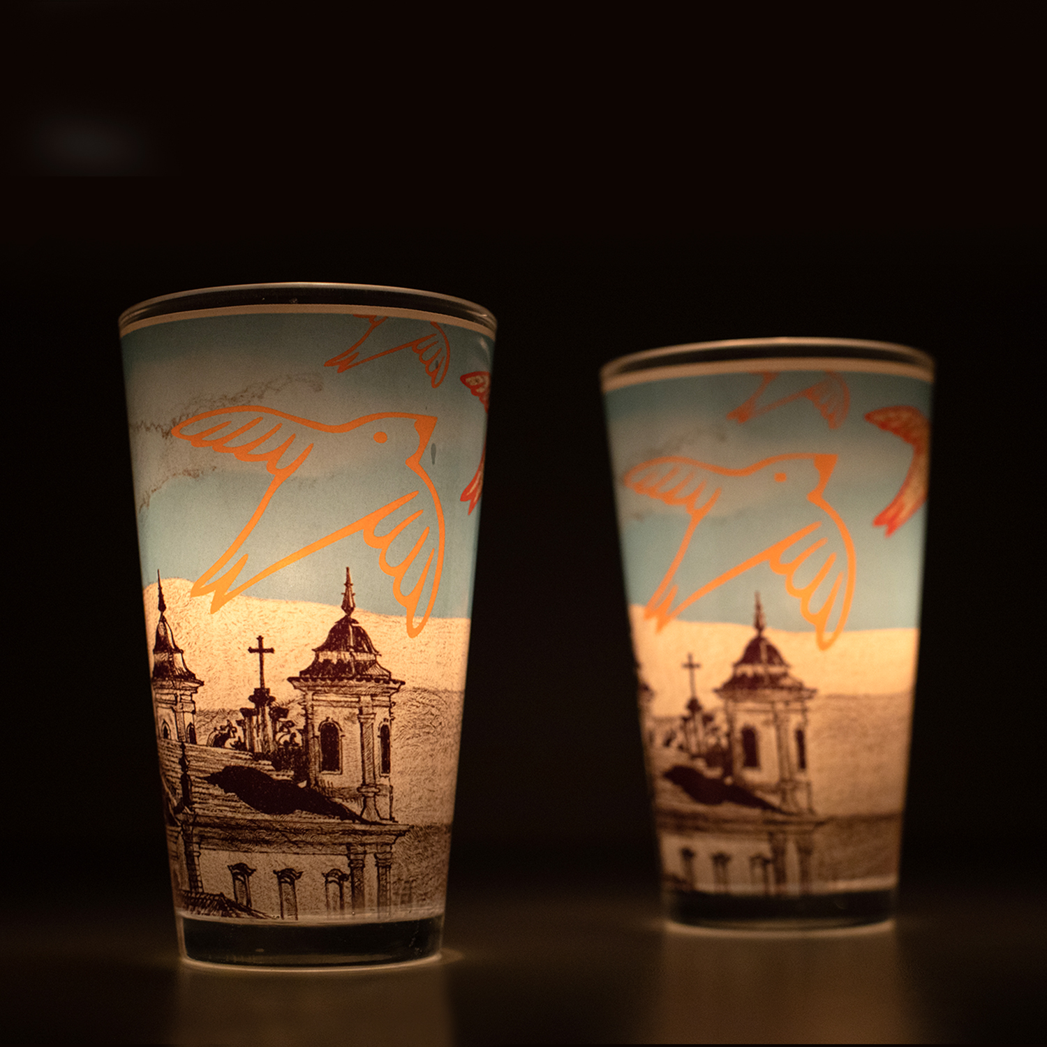 A arte criada colaborativamente pelo estilista Ronaldo Fraga e pelo artista marianense Haroldo Elias veste o porta-velas, criando um efeito de sombras e cores, com um toque de elegância e sofisticação.